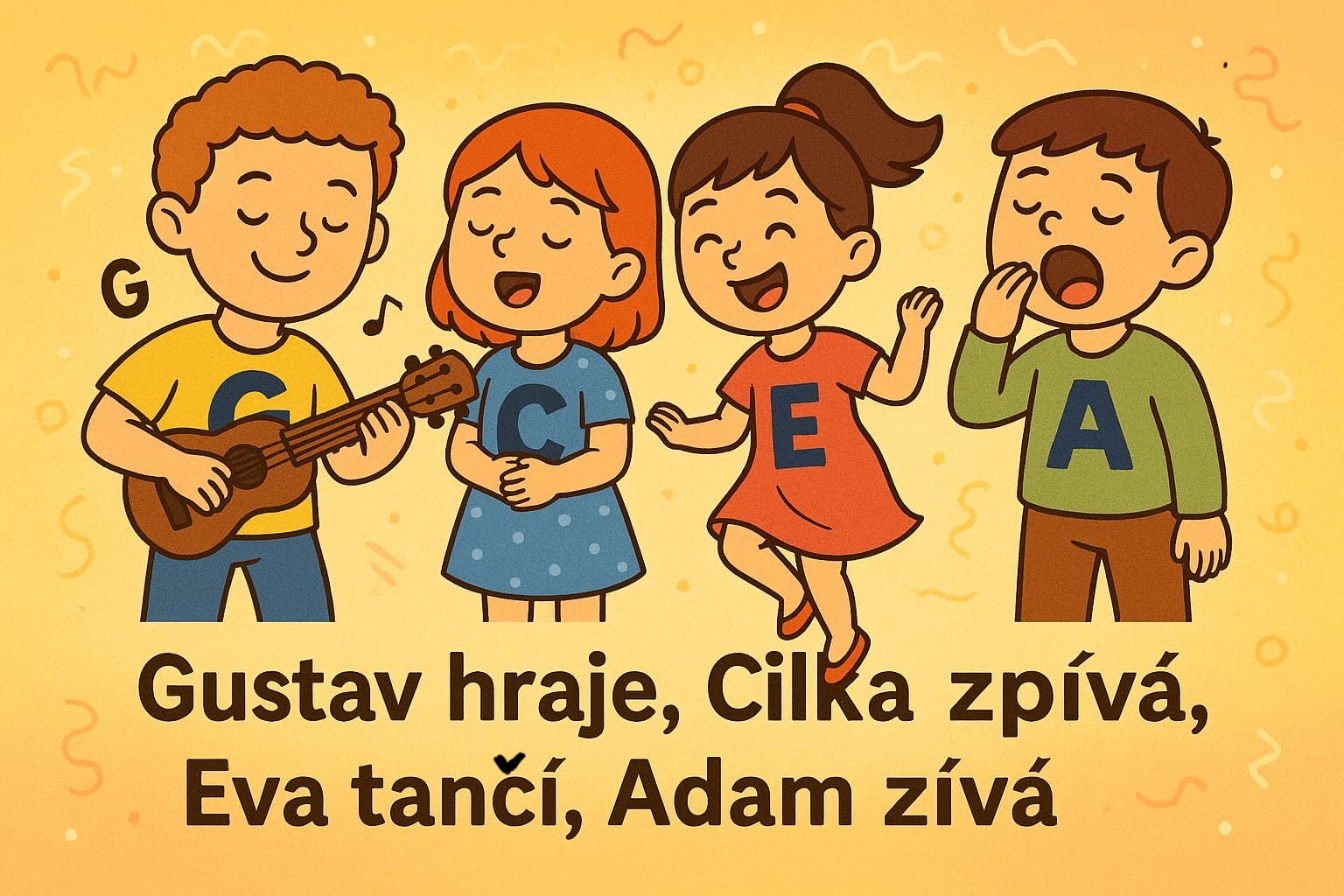 Ukulele 1 (1. třída)- ve skupince je 6 dětí, na začátku hodiny se vždy učíme ladit, známe části nástroje ( tělo, krk, hlava, pražec, políčko =poloha), děti umí názvy strun ( G C E A) - říkanka Gustav hraje, Cilka zpívá, Eva tančí, Adam zívá, intonujeme názvy strun, zpíváme + hrajeme pisničku Dobrý den, dobrý den jak se jmenuješ , Zlatá brána, Ententýky - všechny děti zvládají akord C dur a doprovází v rytmu vždy na 1.dobu. Zpíváme jednoduché dětské písničky ( Pec nám spadla, Běží liška, Když jsem husy pásala) rytmizujeme s orff. nástroji ( dřívka, triangl, xylofon), vytleskáváme rytmus, děláme intonační cvičení - vše formou hry., rozvíjíme muzikálnost a sluchové vnímání. Na poslední hodině ( 22.10.) jsme měli balonky ve tvaru písmen G C E A , děti domů dostaly obrázek na vybarvení a obrázek s hmatem akordu C dur ( vidíte i na fotce nad popiskem Ukulele 1).
